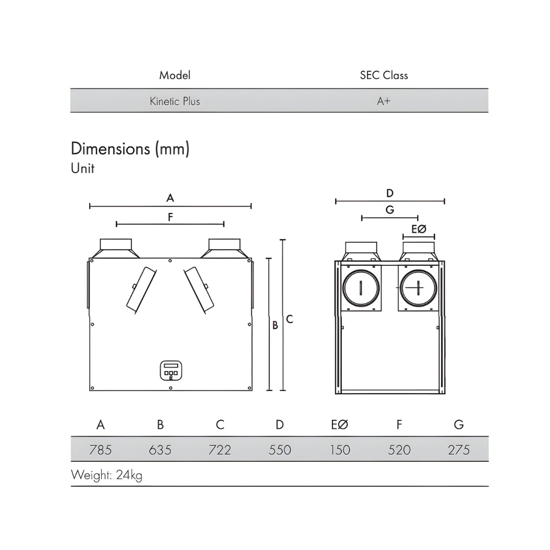 Suitable for houses up to 260m2 and meets the latest requirements of the Building Regulations ADF and ADL for whole house system ventilation. Filtration 2 x G4 with the option of a M5 pollen intake filter Controllability The Lo-Carbon Sentinel Kinetic Plus B have 3 fully adjustable speeds and a purge setting (maximum flow). Provided with the unit is a digital controller that can be used to pre-set the speeds to any required airflow within the performance range Boost can be achieved with almost any type of sensor or switch including momentary Integral Humidity Sensor The integral humidity sensor increases speed in proportion to relative humidity levels, saving energy and reducing noise. The sensor also reacts to small but rapid increases in humidity, even if the normal trigger threshold is not reached. This unique feature ensures adequate ventilation, even for the smallest wet room. The night time relative humidity setback feature suppresses nuisance tripping as humidity gradually increases with falling temperature Construction The outer enclosure is constructed of PVC with the inner body being constructed of EPP Motors The unit has 2 x low energy, high efficiency EC/DC motors Installation Spigot Options The combination of spigot options allows installation in confined locations. If vertical and horizontal connection is required on the same outlet/inlet, additional spigots can be supplied. The condensate drain can be taken out through the back, side or bottom of the unit. Using the fittings supplied, the final condensate connection is made outside the unit and can be completed after installation Accessories In addition to a choice of compatible ducting systems a full range of controls, sensors, in-line silencers, floor/wall/ceiling inlet and outlet diffusers are available to complete the installation.