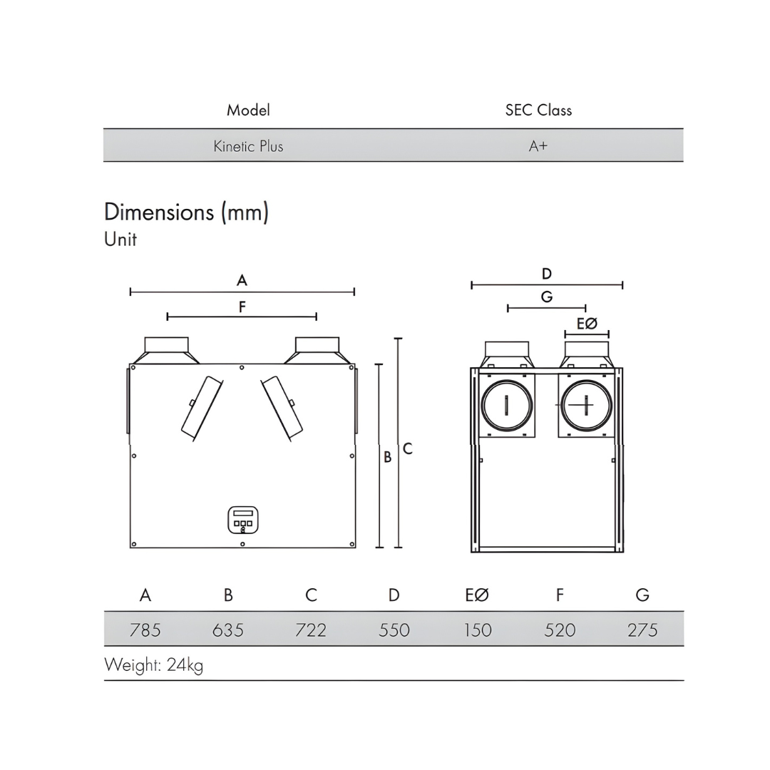 Suitable for houses up to 260m2 and meets the latest requirements of the Building Regulations ADF and ADL for whole house system ventilation. Filtration 2 x G4 with the option of a M5 pollen intake filter Controllability The Lo-Carbon Sentinel Kinetic Plus B have 3 fully adjustable speeds and a purge setting (maximum flow). Provided with the unit is a digital controller that can be used to pre-set the speeds to any required airflow within the performance range Boost can be achieved with almost any type of sensor or switch including momentary Integral Humidity Sensor The integral humidity sensor increases speed in proportion to relative humidity levels, saving energy and reducing noise. The sensor also reacts to small but rapid increases in humidity, even if the normal trigger threshold is not reached. This unique feature ensures adequate ventilation, even for the smallest wet room. The night time relative humidity setback feature suppresses nuisance tripping as humidity gradually increases with falling temperature Construction The outer enclosure is constructed of PVC with the inner body being constructed of EPP Motors The unit has 2 x low energy, high efficiency EC/DC motors Installation Spigot Options The combination of spigot options allows installation in confined locations. If vertical and horizontal connection is required on the same outlet/inlet, additional spigots can be supplied. The condensate drain can be taken out through the back, side or bottom of the unit. Using the fittings supplied, the final condensate connection is made outside the unit and can be completed after installation Accessories In addition to a choice of compatible ducting systems a full range of controls, sensors, in-line silencers, floor/wall/ceiling inlet and outlet diffusers are available to complete the installation.